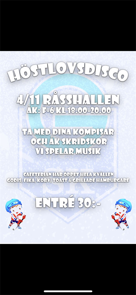 Imorgon lördag är det dags för årets höjdpunkt, skridskodisco i Råsshallen. Entré för barn, vuxna får gärna vara med på isen. Cafeterian är öppen 😋 Varmt välkomna! Hockeyskola Tjej 3 nov 2023 0kommentarer