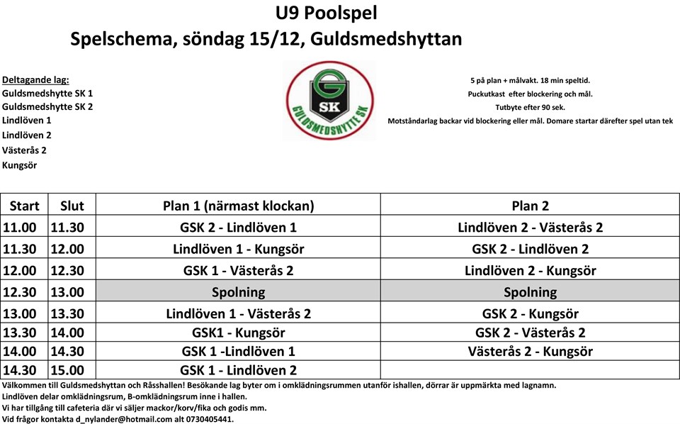 Välkommen till Guldsmedshyttan och Råsshallen! Besökande lag byter om i omklädningsrummen utanför ishallen, dörrar är uppmärkta med lagnamn. Lindlöven delar omklädningsrum, B-omklädningsrum inne i hallen. Vi har tillgång till cafeteria där vi säljer mackor/korv/fika och godis mm. Vid frågor kontakta d_nylander@hotmail.com alt 0730405441. U-9 9 dec 2019 1kommentar