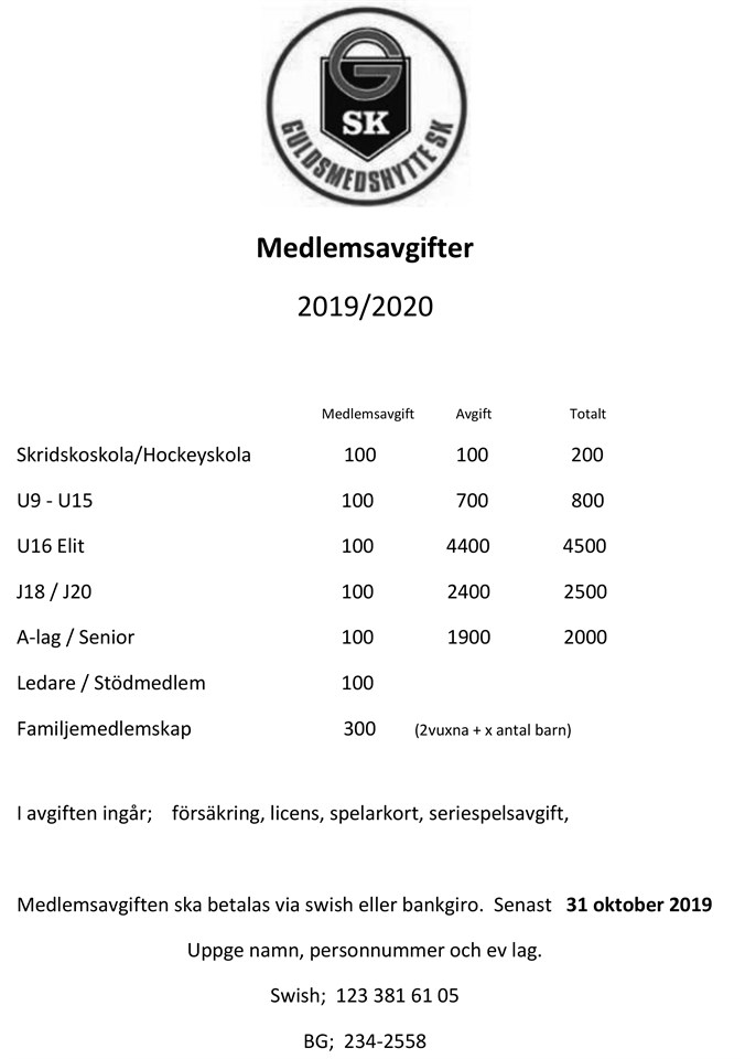 Då var det dags att betala säsongens medlemsavgift. I avgiften ingår: Försäkring, licens, spelarkort, seriespelsavgift. U9-U15 800:- Medlemsavgiften ska betalas via swish eller bankgiro. Senast 31 oktober 2019. Uppge namn, personnummer och ev lag. Swish; 123 381 61 05 BG; 234-2558