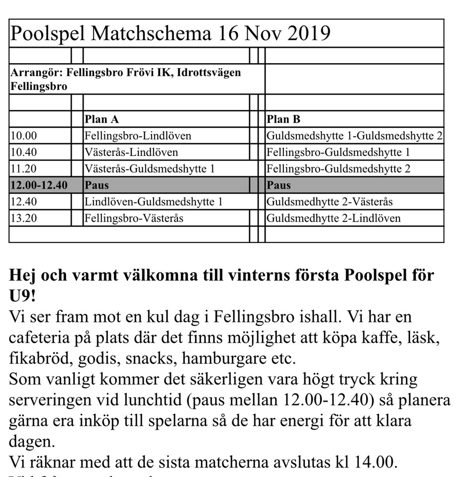 Spelschema poolspel Fellingsbro Lördag 16 Nov