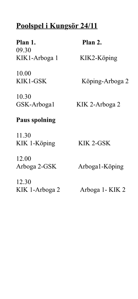 Hej Vi fick med kort varsel förfrågan om vi vill komma till Kungsör på Söndag 24/11 då dom hade fått avhopp. Skickar snart ut en kallelse för er som är intresserade och bifogar här spelschemat. Nästa poolspel är i Lindesberg 1/12.
