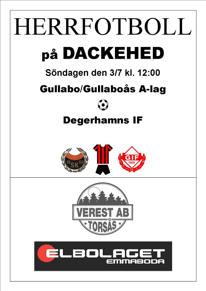 På söndag kommer Degerhamn på besök på Dackehed. Matchen startar kl 12:00. Välkomna till heden! Gullabo Sportklubb 1 jul 2022 0kommentarer