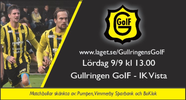 Kom och besök Gullemon idag kl 13.00 då serieledarna IK Vista kommer och hälsar på! Vista som imponerat stort som nykomling och leder serien med fyra poäng före Tranås och sju framför oss! Nu vill vi minska avståndet till fyra! Bortamatchen var en jämn match och kunde slutat hur som helst men där Vista till slut kunde dra det längsta strået och vinna med 2-0 på en mycket lite plan. Nu ska vi ta revansch när vi kommer ut på en större yta! Vi kommer med följande trupp: Tom, Högga, Alex, Ola, Hampe, Albin, Felix, Edvin, Linus, Olle, Ralle, Victor, Jeppe, Hoppe och Basse
