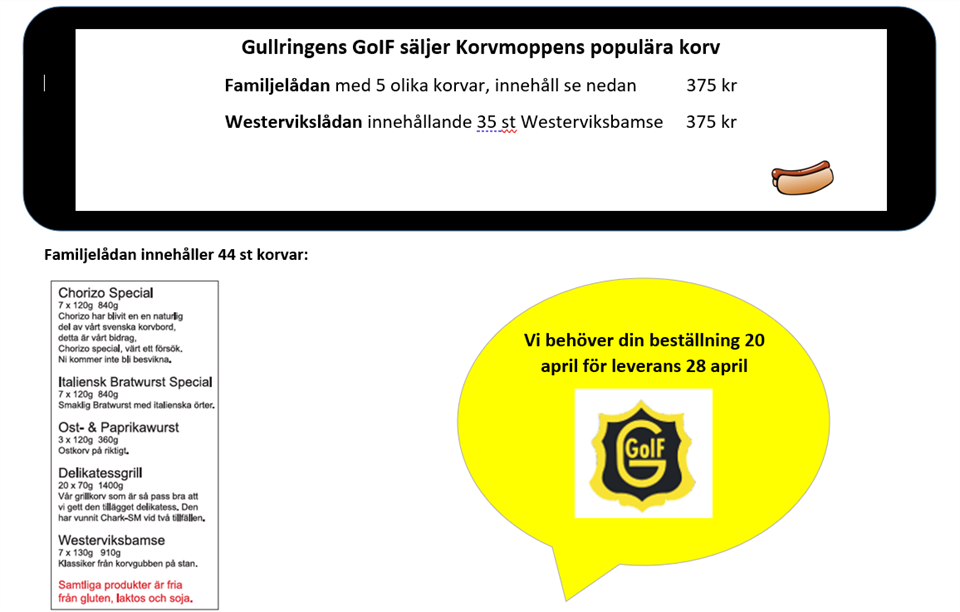 Lagom till grillsäsongen drar igång på allvar så säljer vi nu Korvmoppens korvlådor. Familjelåda med 5 olika sortes korv 44 st - 375 kr Westervikslåda innehållande 35 st grillkorv Westerviksbamse - 375 kr Senast 20 april behöver vi din beställning för leverans 28 april Sms:a eller ring 076-1155193 Jessica Eriksson för beställning