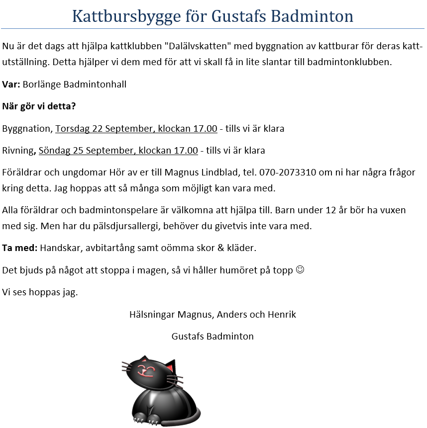 • Mjau! Dags för kvällsaktivitet i Borlänge Badmintonhall.