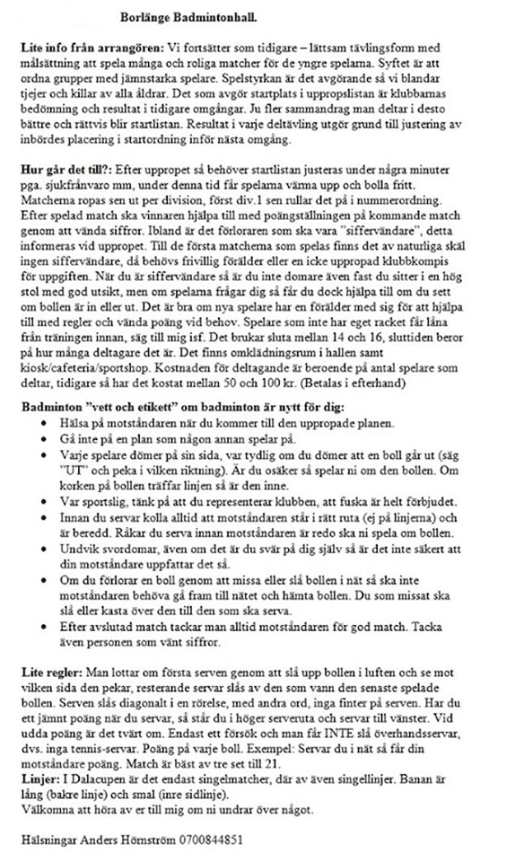 Hej alla härliga badmintonspelare! Söndagen den 18 december så är det dags igen för Dalacupen! Upprop Kl 09:30 i Borlänge Badmintonhall. Hoppas många av er kan och vill vara med på denna roliga träningstävling. Ursäkta denna senna påanonssering. Anmälan genom att förälder sms:ar namn på spelare till Anders 0700844851. Anmälan så fort som möjligt. Gärna senast måndag. 2022-12-12. För er som är med första gången eller vill friska upp minnet så bifogar jag en bild med info. Hälsningar Tränarna. Badminton Barn 9 dec 2022 0kommentarer