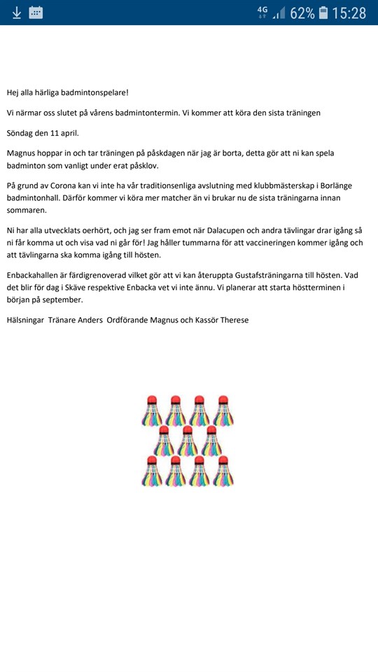 Här kommer goda nyheter för oss som vill spela badminton. Idag (25/1-2021) öppnar Säters kommun idrottshallarna för barn födda år 2002 eller senare. Vi får träna om vi kan göra det på ett smittsäkert vis, så det gäller att vi är noga med god handhygien och hålla avstånd. En annan nyhet är att det får vistas max fyra personer i ett omklädningsrum. Om vi ska klara det så måste alla komma ombytta och bara hänga av sig ytterkläderna för att sen gå direkt in i hallen. Bra är alltså om barnen leker ute eller väntar i skjutsade bil tills det är dags för träning. Så välkomna på träning med start söndagen den 31/1–2021 i Skäve Arena, samma tider som vi hade fram tills juluppehållet. Så får vi se när Enbackahallen blir tillgänglig för träning där någon gång under våren. Tisdagar 17.30-18.30 (Grupp1) 18.30-19.30 (Grupp 2) Söndagar 18.00-19.00 (Grupp1) 19.00-20.00 (Grupp 2) Vuxna gruppen är alltså fortsättningsvis inställd tyvärr. Vi återkommer kring gruppen om man lättar på restriktionerna framöver. Badminton Barn 25 jan 2021 0kommentarer