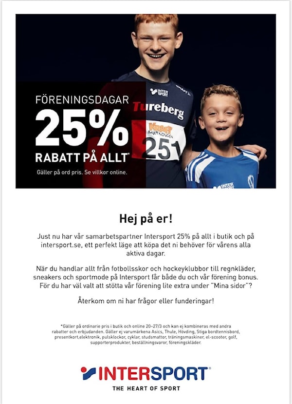 När du handlar på Intersport är du samtidigt med och stöttar vår förening. För du har väl valt att stötta vår förening lite extra under ”Mina sidor”?