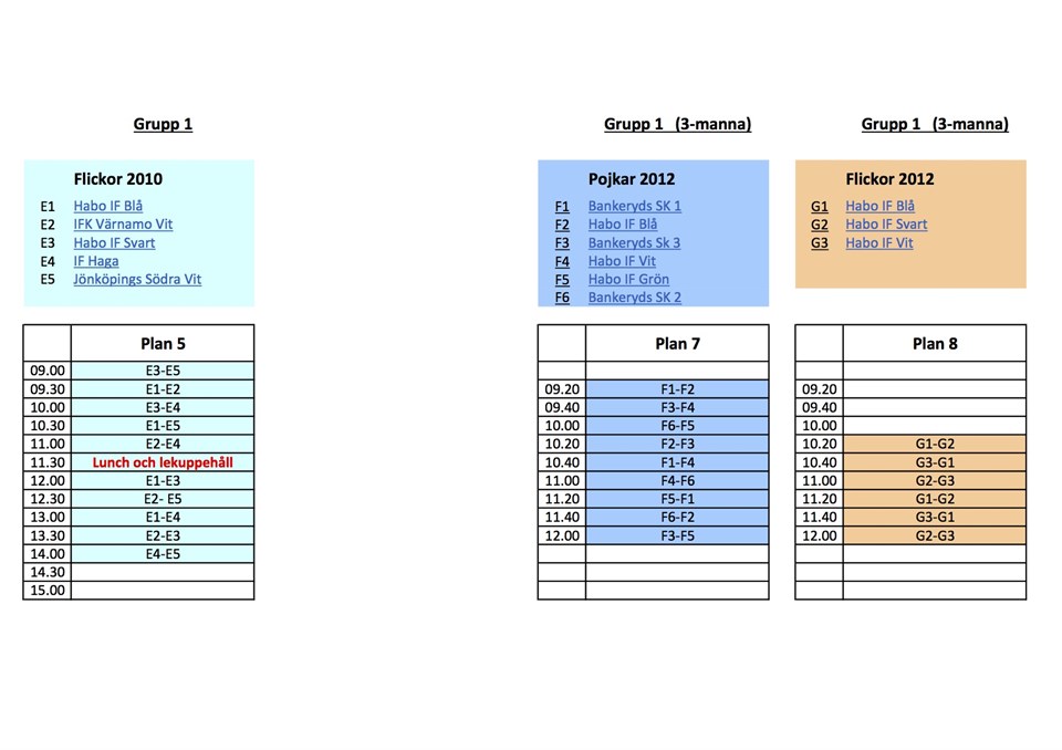 Nu laddar vi för en helg i fotbollsanda. Vi startar med träning som vanligt på fredag och sen på söndag ska vi ha en rolig dag på Jordbrovallen i Jönköping. Vi samlas på Slätten 1 på söndag klockan 8.15. Då ska barnen komma ombytta. Så glöm inte fotbollsskor, shorts, benskydd, fotbollsstrumpor och vattenflaska. Vi kommer ha matchtröjor med oss. Tänk på att kolla vädret och kanske ha med lämpliga kläder om det bjuds på regn. I skrivandet stund ska det inte regna men det ska vara mörka moln och en temp mellan 13-19 grader. På bilden är vårt spelschema och laguppdelningen kommer vara färdig tills vi träffas upp. Som ni kan se i gruppen för "flickor 2012" så är det lag enpart från oss i Habo IF. Så tjejerna kommer få möta varandra i lagen. Alternativet var att ställa in cupen för tjejerna och det vill vi såklart inte så vi kör på och ser till att det blir en kul första cup erfarenhet med gemenskap och pepp. Två viktiga saker som vi ska komma ihåg. 1. Mellis, energin ska hålla i några timmar. Så ta med för att fylla på både till ert barn och till er själva. 2. Prata med ert barn om att vi ska ha roligt. Vissa barn kommer vara nervösa och vissa kommer vara heltaggade på match. Alla är olika och det får man vara. Som lag och individ har vi vunnit när vi tillsammans gör vårt bästa och har kul. Är det några frågor så mejla mig gärna. Jag skickar såklart vidare eventuella frågor som jag inte kan svara på till vår ledargrupp och återkommer till er så fort jag kan. Ha en bra vecka nu så syns vi snart! P-12 21 aug 2018 11kommentarer