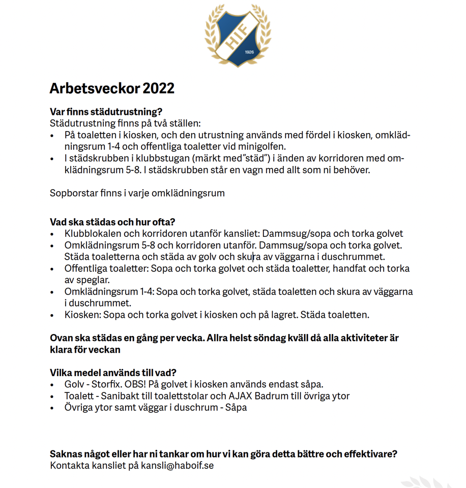 Hej, nu är det P07/08’s tur att ha vår arbetsvecka på slätten. Detta är sista veckan kiosken på slätten är öppen men utgångspunkten är att vi håller öppet de tider som är kommunicerade dvs mån-fre 17-20 och lör-sön 9.30-20.00. Viktigaste såklart är att vi har öppet då matcher pågår och kan serva/sälja kaffe mm då. Matchschemat hittar ni på laget.se och kalender. Boka in nedanstående tider i kalendern. En tagg behövs för att komma in i kiosken och denna tagg hämtas andra passet tisdag 27/9 hos mig. Därefter lämnar den som stänger kiosken taggen till nästa funktionär på listan. Som vanligt byter ni er emellan om någon tid inte funkar alls för er. KIOSK Mån 26/9 17.00-20.00 Måns Wangström Tis 27/9 17.00-20.00 Jonatan Meuchas Ons 28/9 17.00-20.00. Christoffer Jangmo Tors 29/9. 17.00-20.00. Lukas Oliviera Cursivo Fre 30/9 17.00-20.00. Liam Nilsson Lör 1/10 9.30-12.00 Elias Gadd Lör 1/10 12.00-14.30 Arvid Unosson Lör 1/10 14.30-17.00 Ludvig Eriksson Lör 1/10 17.00-20.00 Mille Maltell Sön 2/10 9.30-12.00. Viggo Karlsson Sön 2/10 12.00-14.30 Victor Diber Sön 2/10 14.30-17.00 Oscar Krantz Sön 2/10 17.00-20.00 Milton Ortstam STÄD söndag 2/10 kl 16.00- Arvid Sandberg Wille Sjödell Theodor Rogö Max Wulff Emil Sandell Hör av er till mig om ni har några frågor. Allt gott! /Fredrik Wangström, 0706-115460