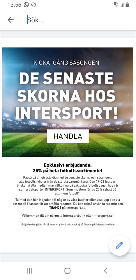 På tisdag 18 februari mellan 15-19 kommer Adidas komma till Intersport och då har man chansen att beställa dom senaste fotbollskorna. Fördelen med detta är att Adidas har med sig samtliga skomodeller samt att de just nu har fått in släppen på Nike och Puma. S¨här skriver de också: Exklusivt erbjudande fråm Intersport. 25% på hela fotbollssortimentet Passa på att utrusta dig med de senaste skorna och säsongens alla fotbollsnyheter från de största varumärkena. Den 17–23 februari önskas alla medlemmar välkomna på exklusiva fotbollsdagar hos INTERSPORT! Som medlem får du 25% rabatt på allt inom fotboll*. Ta med den här inbjudan till någon av deras butiker eller visa upp den via din mobil i kassan för att erhålla rabatten. Du kan också använda rabattkoden TEAM25 på intersport.se. Välkommen till din närmsta Intersportbutik eller intersport.se! *Erbjudandet gäller 17–23 februari på ord.pris, dock ej på föreningskläder/teamkläder. P-04 13 feb 2020 0kommentarer