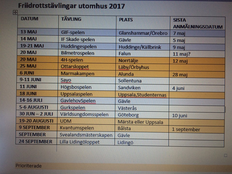 Här presenteras några av de friidrottstävlingar och terränglopp som arrangeras utomhus 2017. Vi tränare slår ett extra slag för de gulmarkerade tävlingarna. Vi hoppas kunna ordna gemensamma resor om vi blir några stycken som åker från Vänge. Tränarna
