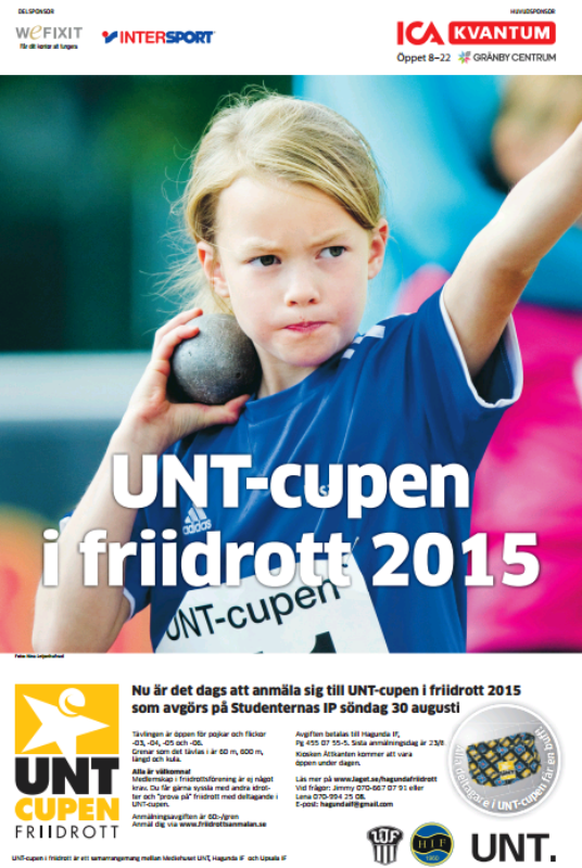 Söndag 30 augusti är det dags för UNT-cupen i friidrott på Studenternas IP. Tävlingen är för pojkar och flickor födda 2003, 2004, 2005 och 2006. Mer information hittar ni i menyn "UNT-cupen 2015" till vänster. Välkomna! Friidrottssektionen 17 jun 2015 1kommentar