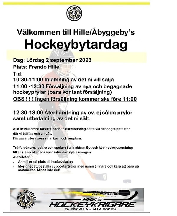 11:00 - 12:30 Försäljning av nya och begagnade hockeyprylar