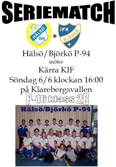 Då var det dax för 6:e seriematchen på söndag 6/6 mot Kärra KIF på Klarebergsvallen klockan 16:00, vi tar färjorna 14:20 från Hönö resperktive 14:30 från Björkö och samlas på Varholmen. - LAGET SOM SKALL SPELA: 1 William Alexandersson 2 Andreas Jernarp 3 Johan Forseström 4 Joshua Berntsson 5 Magnus Lundgren 6 Gustav Lundbäck 7 Johan Åstrand 8 Henrik Gustafsson 9 Marcus Wiseman 10 Frans Dino 11 Erik Alexandersson 12 Petter Magnusson 13 Pontus Karlsson 14 Emil Henricsson 15 Jesper Hidetun