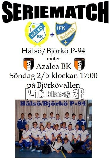 Då var det dax för 3:e seriematchen på söndag 2/5 hemma mot Azalea BK, på Björkövallen klockan 17:00 (samling senast kl 16:00) Hemmamatch betyder storpublik, café och matchprogram, kom å heja fram vårat ungdomslag. LAGET SOM SKALL SPELA: 1 William Alexandersson 2 Rasmus Einarsson 3 Emil Henricsson 4 Gustav Lundbäck 5 John Samuelsson 6 Erik Alexandersson 7 Samuel Tidefors 8 William Wallich 9 Marcus Wiseman 10 Andreas Forsmark 11 Johan Forseström 12 Henrik Gustafsson 13 Pontus Karlsson 14 Jesper Hidetun 15 Andreas Jernarp