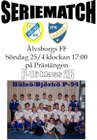 Då var det dax för 2:a seriematchen på söndag 25/4 hemma mot Älvsborgs FF, på Prästängen klockan 17:00 (samling kl 16:00) Hemmamatch betyder storpublik och matchprogram, kom å heja fram vårat ungdomslag. - LAGET SOM SKALL SPELA: 1 William Alexandersson 2 Rasmus Einarsson 3 Emil Henricsson 4 Gustav Lundbäck 5 Julius Lindblom 6 Erik Alexandersson 7 Andreas Jernarp 8 Henrik Gustafsson 9 Marcus Wiseman 10 Joshua Berntsson 11 Johan Forseström 12 Petter Magnusson 13 Pontus Karlsson 14 Jesper Hidetun 15 Johan Åstrand