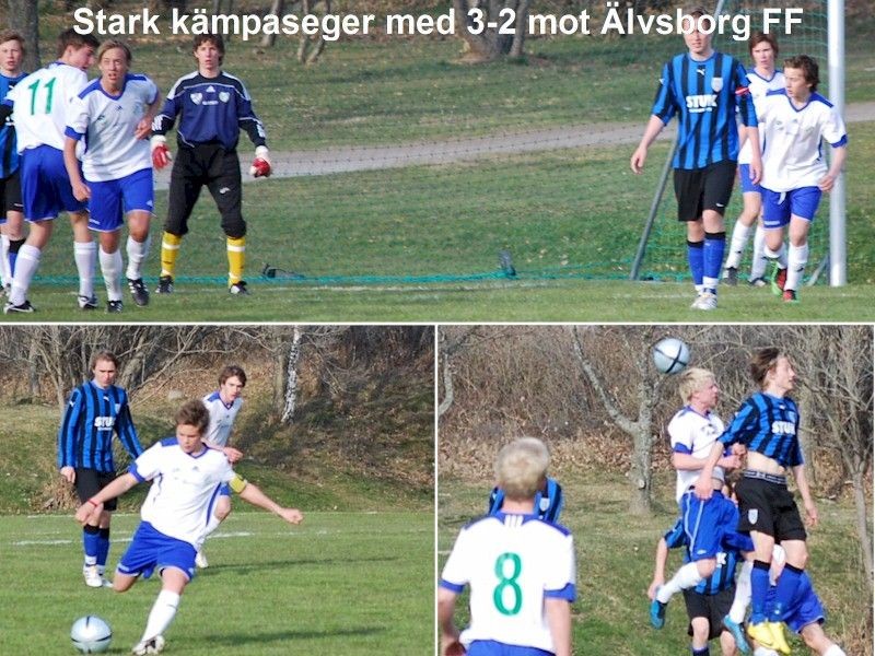 Hälsö/Björkö - Älvsborgs FF (3-2) Hälsö/Björkös mål gjordes av: 1-0 (18min) Johan Forseström, 2-1 (40min) Andreas Jernarp och 3-1 (44min) Henrik Gustafsson. - Foton från Älvsborgsmatchen - 2:a seriematchen och hemmamatch mot Älvborgs FF, även om denna spelades på Prästängen 2. Vi har ju en treveckors period med Polenresor för killarna och den gångna veckan var det hela 7 spelare borta i Polen. Frågan var om vi lyckades ladda om batterierna till denna matchen. Vi visste att Älvsborg är ett tufft spelande lag med högt tempo, så det gällde att vara på tårna redan från start. Domare Besim blåste igång matchen och det var högt tempo och bra intensitet redan från starten. - Älvsborg satsade på snabba raka djupledsbollar och vid flera tillfällen var det farliga anfall emot oss. Vi arbetar oss dock in mer och mer i matchen och efter (18min) kommer en fin djupledsboll från Emil Henricsson till Johan Forseström som rycker ifrån försvarare och skjuter in 1-0, men kolliderar samtidigt med målvakten som går ut lite bryskt i duellen, Johan får en smäll över munnen och en rejäl lårkaka och tvingas bryta matchen, in kommer då Jesper Hidetun. Vi är nu inne i en bra spelperiod. - (21min) och "Pontus Wiseman" får ett gult kort (ni vet vad vi menar). (25min) Bra spel igen och bollen går till Andreas Jernarp som får till ett skapligt långskott och (28min) bra frisparksläge som Jernarp tar och det blir farligt igen, nu spelar vi riktigt bra, men då ställer Älvsborg snabbt om med en av sina farliga djupledsbollar (33min) och gör 1-1, kanske rättvist sett till spelet. (38min) Gult kort till Henke och domaren var tydlig i sina bedömningar och det behövdes, för matchen var relativt hård och tuff. (40min) i slutminuten bra anfall där Pontus spelar fram Andreas Jernarp, som siktar och skjuter ett underbart långskott i målvaktens högra burgavel. Psykologiskt mål precis innan halvtidsvilan. - 2:A HALVLEK Vi startar 2.a halvlek i högt tempo och bra spel igen, flera fina kombinationer redan i halvlekens inledning. Bollen går på ett snöre mellan Josh-Marcus-Jernarp bland annat, spelat vänder snabbt (3min) och Älvsborg anfaller och får ett friläge, skott mitt på Wille är bra ute och räddar. (3min) Josh får bra läge och drar på en vänsterkanon strax utanför, högt tempo och händelserikt värre. (4min) 3-1 Henrik Gustafsson efter passning från Joshua Berntsson, Henke skottfintar med vänstern, vänder om och skjuter snabbt med högern vid målvaktens högra stolpe. Matchen fortsätter i högt tempo och stundtals är det lite irriterat på planen. - (13min) och en Älvsborgsspelare får sitt andra kort (lagkaptenen) och blir utvisad, minuten senare får även Åstrand ett gult kort och domaren försöker stävja spelet. Älvsborg tappar ändå inte spelet trots bara 10 man på planen utan man kämpar på i samma höga tempo. (24min) Älvsborg djupledsboll och där är man snabbare än oss och trycker in reduceringen 3-2. Det är helt klart en händelserik match och spännande. - (27min) En underbar passning från Jesper till Henke, men domaren blåser tyvärr för offside (tveksamt). Spelet böljar fram och tillbaka. I den (29min) får Älvsborg en frispark i farligt läge och får till ett kanonskott som seglar mot krysset, men Wille i målet gör en fantomräddning. (31min) Nu är det vi som har en kanonad av chanser i Älvsborgs straffområde, Marcus och Jesper har läge på läge och bollen räddas flera gånger på mållinjen av utespelare och målvakt, snacka om spännande. - En stark kämpainsats denna dag, kanske inget skönspel, men bra inställning, även Prästängens gräsplan var väl inte den jämnaste nu så här i början av säsongen, men bra kämpat killar och tre viktiga poäng, vi är med i toppen. Nu väntar träningar TIS 27/4 och TORS 27/4 på Hälsö klockan 17:00, för att sedan ta oss an Azalea BK på SÖN 2/5 på Björkövallen. - LAGET SOM SPELADE: MÅLVAKT William Alexandersson BACK Rasmus Einarsson Emil Henricsson Gustav Lundbäck Julius Lindblom MITT1 Erik Alexandersson Andreas Jernarp MITT2 Henrik Gustafsson Marcus Wiseman Joshua Berntsson TOPP Johan Forseström RESERVER Jesper Hidetun Johan Åstrand Pontus Karlsson Petter Magnusson