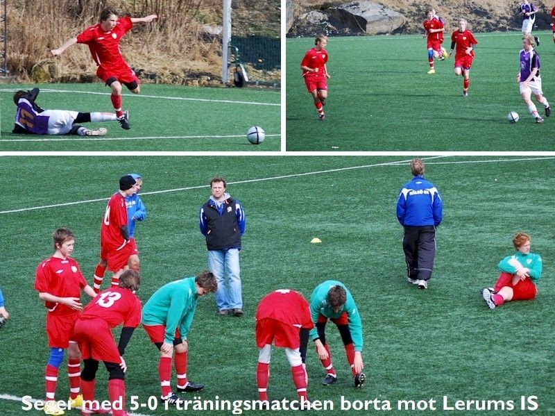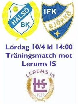 Lerums IS – Hälsö/Björkö (0-5) Hälsö/Björkös mål gjordes av: 0-1 (12min) Johan Åstrand, 0-2 (23min) Johan Forseström, 0-3 (56min) Henrik Gustafsson, 0-4 (70min) Gustav Lundbäck och 0-5 (74min) Henrik Gustafsson. - Det var soligt och härligt (+8 grader) när vi åkte hemifrån, men när vi kom till Lerum var det mer mulet och blåsigt, men förutsättningarna till en bra fotbollsmatch fanns trots allt. Sista träningsmatchen innan seriepremiären och detta var den 7:e träningsmatchen i ordningen och det är ju ändå rätt så bra trots den långa vintern. Vi har ju blivit mer och mer samspelta under dessa månader och spelsystemet 4-2-3-1 verkar sitta allt mer, alla vet sina roller. Denna dag hade vi extrainkallat Emil Mattsson och Alexander Hallberg från Björkö med anledning av att flera killar var bortresta och sjuka bl.a. och att träningsnärvaron varit lite låg för vissa. - Domaren blåste igång matchen och de första 10 minuterna var det väl inget riktigt ordnat spel från något av lagen, matchen böljade fram och tillbaka, med mycket spel på mittplan. Erik och Emil M styrde spelet på mitten och försökte få ordning på passningsspelet. (4min) Tide väggspelar snyggt med Åstrand på vänsterkanten och kommer ner hela vägen in till straffområdet, bra intentioner av killarna. (12min) 0-1 Johan Åstrand efter en mycket snygg rutinerad djupledspass efter backen av Gustav Lundbäck och Åstrand är hur kylig som helst och placerar in bollen i mål. (23min) 0-2 Johan Forseström prickskjuter in bollen efter passning från Mattsson och Forse dribblar sig in i straffområdet från högerdelen av straffområdet och skjuter ett snabbt skott i mål. Vi förde nu större delen av spelet och Petter på högerkanten snurrade upp motståndarna ett flertal gånger, mittfältet agerade med stor pondus och stundtals var det sevärt spel. (32min) Lerum har ett farligt friläge, men Wille i målet gör en fin räddning. I övrigt såg det väldigt stabilt ut i backlinjen med Gustav och John i mitten som styrde samt Tide och Alex på kanterna. Halvlek, genomgång och lite snack. Vi gjorde några byten i halvlek och in kom Henke och Pontus. (8min) Vi får en hörna och den slår John mot den främre stolpen, där står Henke och nickskarvar (tror vi) och bollen tar i kryssribban, bra chans igen. Nu ökar vi tycket allt mer mot Lerums straffområde. (14min) Forse ett halvfarligt långskott, (15min) Erik ett halvfarligt långskott och pressen ökar. (16min) 0-3 Henrik Gustafsson efter snyggt spel där Pontus nickar fram bollen till Mattsson som sedan skarvar vidare till Henke. - (20min) Lerum repar mod och kommer i ett snabbt anfall och skottet går i stolpen. (21min) Snyggt klapp-klapp-spel med flera fina passningar, Alex till Pontus som spelar in till Åstrand och ut till Pontus igen på högerkanten, går förbi backen och slår ett fint inlägg till Henke. Lerums målvakt får under den andra halvleken göra säkert 8-10 kvalificerade räddningar, på flera fina lägen som vi hade. (23min) Henke friläge men målvakten räddar, (28min) Henke friläge igen och ännu en gång är målvakten fint ute och räddar. (30min) 0-4 Gustav Lundbäck dundrar in bollen efter snyggt tillbakaspel från Henke som tråcklat sig förbi sin back nere vid sidlinjen på vänsterkanten och passar sedan snett inåt bakåt till Gustav som trycker till. (34min) 0-5 Henrik Gustafsson igen och denna gång efter passning från Emil Mattsson som gör sin 3:e assist för dagen. - Bra jobb denna dag killar och nu ser vi närmast fram emot seriepremiären på måndag borta mot Eriksberg och sedan på fredag åker vi på träningsläger till Höganäs. - LAGET SOM SPELADE: MÅLVAKT William Alexandersson BACK Alexander Hallberg John Samuelsson Gustav Lundbäck Samuel Tidefors MITT1 Erik Alexandersson Emil Mattsson MITT2 Petter Magnusson Johan Forseström Johan Åstrand TOPP Andreas Forsmark RESERVER Pontus Karlsson Henrik Gustafsson