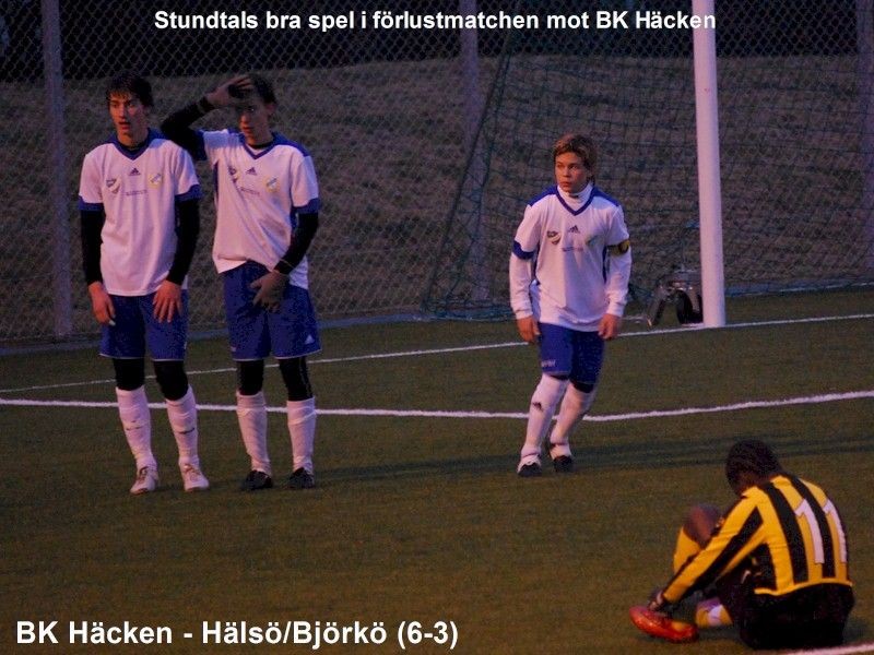 BK Häcken – Hälsö/Björkö (6-3) Hälsö/Björkös mål gjordes av: 2-1 (48min) Marcus Wiseman, 5-2 (65min) Marcus Wiseman (straff) och 5-3 (72min) Andreas Jernarp. - Träningsmatch borta mot BK Häcken igen, dom hade fått ett matchåterbud och ställt frågan till oss om ännu en match. Vi hoppade på för vi vet att laget ändå mår bra av att få köra så många träningsmatcher som möjligt och att få köra på konstgräs och få matchträning är viktigt. - Matchen startar i ett bra tempo och vi hänger bra med i svängarna och spelet är jämnt de första 15 minuterna. (10min) Häcken kommer i ett fint anfall på vänsterkanten förbi vårat försvar och Häckenspelaren slår ett fint inlägg och det blir en farlig målchans med nick mot mål, men Acke gör en fantom- och TV räddning. (Acke stod den 1:a halvleken och Wille i den 2:a idag). Vi skapar några halvchanser men sedan tar Häcken över allt mer av spelet och vi tappar i rörelsen utan boll vilket begränsar våra passningsalternativ när vi väl får tag på bollen. (18min) Häcken får en straff efter en genomlöpning där Andreas J skaver lite på Häckenspelarens ben, han ramlar nästan och missar målchansen och domaren blåser straff, som sätts säkert till 1-0. (19min) 2-0 och nu var vi inte riktigt på tårna och tappade en del i vår markering. Vi började halvleken bra men tappade en del av inställningen i den andra halvan av halvleken även om vi stundtals hade några bra spelsekvenser, framför allt möjligheten i den (30min) med mycket bra spel där Marcus snyggt spelar fram Forse som rycker och får fritt skottfält, men Häckens målvakt gör en mycket fin reflexräddning. Halvtidsvila och taktiksnack. - 2:a halvlek och vi startar optimistiskt och höjer vårt speltempo en aning, redan i den (8min) skapar vi ett bra tryck och bra spel på Häckens planhalva, där Marcus och Pontus på högerkanten spelar ”Ryskt klapp-klapp spel” och när Pontus till sist passar tillbaka till Marcus, som rycker in och skjuter säkert in 2-1 vid målvaktens vänstra stolpe, då var vi på gång igen kändes det som. Men bara några minuter senare (11min) så slarvar vi lite och bollen går till en Häckenspelare strax utanför vårat straffområde och han får ostört stå och ladda ett långskott som går in otagbart för Wille i målet, 3-1. (16min) Vi får en frispark emot oss från Häckens vänsterkant utanför straffområdet och mur ställs upp och alla kanske väntar sig ett inlägg, men Häckenspelaren drar på rätt mot mål och bollen går in i den bortre burgaveln, där borde vi kanske haft en spelare på den bortre stolpen. 4-1 och humöret på spelarna gick nu tyvärr ner lite, men det gällde att peppa och aldrig ge upp, det gäller att visa att vi även kan spela snygg fotboll även i motgång. Men nu gick det undan och Häcken är inne i en bra spelperiod igen. (20min) 5-1 där Häcken tar bollen ifrån oss på mitten och man har alltid snabba omställningar när man bryter bollen, det var den stora skillnaden mellan lagen idag och spel i djupled och Häckenspelaren dribblar sig igenom och förbi Wille i målet och skjuter in 5-1, där hängde vi inte riktigt med. Men efter detta började vi faktiskt jobba oss in i matchen igen och det skall ni killar ha en stor eloge för att trots 5-1 underläge så var det upp med huvudena och spelet började komma igång igen. - (25min) får vi en straff efter det att Henke ”fastnat” på en Häckenspelare (eller också läser ni brutalt fälld om ni vill) fram stegar Marcus och sätter straffen säkert till 5-2. Efter detta tar vi faktiskt tag i matchen och stundtals för vi spelet. Många bra spelsekvenser och i den (34min) får Andreas Jernarp bollen på mittplan ca 35 meter från mål, tittar upp och drar på ett mäktigt långskott som går i en båge och i mål strax under ribban, snyggt mål och jubel bland publiken. Vi fortsätter spela bra fotboll, men i slutet får Häcken några målchanser och Wille gör en kanonräddning på ett friläge, men får bollen i ansiktet och tvingas byta efter en stund och i slutminuten (39min) rensas tyvärr bollen av oss rätt ut i mitten till en Häckenspelare som drar på ett långskott i en båge över Acke i målet och fastställer därmed slutresultatet till 6-3. - Trots allt en bra match stundtals även om vi föll ner i vissa svackor under matchen där vi inte alls var med i närkampsspelet och i rörelsen utan boll. Det som är så viktigt är att ta löpningar även om man kanske inte alltid får passningen, detta för att skapa ytor åt andra. Yttermittfältarna borde ryckt ut på kanterna mer när vi kom i våra anfallsförsök, för vi fastnade alltför ofta inne i mitten för att det blev för trångt. Vi saknade även att det kunde vara mer att man kom och mötte den som hade bollen och inte bara sprang på djupet, variationen i spelet är viktig. Men vid de tillfällen då detta funkade, med spelvändningar mm så såg det riktigt lovande ut. Nu är det påskledigt några dagar och vi drar igång igen på TIS 6/4 klockan 16:30 på Hjällviks grusplan och det är viktigt att alla kommer då, seriepremiären närmar sig och även träningslägret och vi måste alla vara på tårna nu när vi går in i april månad. - LAGET SOM SPELADE: MÅLVAKTER Andreas Johannesson William Alexandersson BACKAR Rasmus Einarsson Andreas Jernarp Emil Henricsson Johan Åstrand MITT1 Erik Alexandersson Joshua Berntsson MITT2 Pontus Karlsson Marcus Wiseman Andreas Forsmark TOPP Johan Forseström RESERVER Henrik Gustafsson Petter Magnusson
