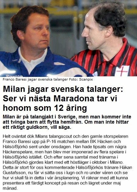Ser vi nästa Maradona tar vi honom som 12 åring Milan är på talangjakt i Sverige, men man kommer inte att tvinga barn att flytta hemifrån. Om man inte hittar ett riktigt guldkorn, vill säga. - Helt oväntat dök Milans talangscout och den gamle storspelaren Franco Baresi upp på P-16 matchen mellan BK Häcken och Hälsö/Björkö sent under onsdagen. Han hade tipsats om några Häckenspelare, men han blev mer imponerad av flera spelare i Hälsö/Björkö istället. Och efter sena samtal med tränarna i Hälsö/Björkö gjordes klart med ett höstläger i oktober i Milano. Detta är stort för oss kommenterade Hälsö/Björkös tränare Håkan Gustafsson, nu får vi sätta oss i lugn och ro under våren och se hur vi skall få in detta i vår årsplanering. Vi räknar med att kunna presentera ett färdigt koncept på resan och lägret under maj månad. Läs mer om artikeln på fotbollskanalen.se