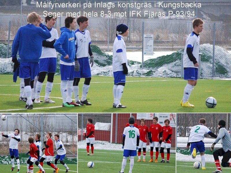 IFK Fjärås - Hälsö/Björkö (3-8) Hälsö/Björkös mål gjordes av: 2-1 (32min) Johan Forseström, 2-2 (34min) Johan Forseström, 2-3 (46min) Marcus Wiseman, 2-4 (48min) Marcus Wiseman, 2-5 (73min) Andreas Forsmark, 2-6 (78min) Marcus Wiseman, 2-7 (84min) Rasmus Einarsson och 2-8 (87min) Andreas Forsmark. FOTON FRÅN FJÄRÅSMATCHEN - Bortamatch mot IFK Fjärås P-93/94 och detta laget visste vi inte så mycket om, men det gällde att ha rätt inställning och vilja. Det var en härlig lördagsförmiddag och solen kom fram lite grann +5 grad ungefär. Matchen skulle spelas på Inlags konstgräsplan vid Kungsbacka sportcenter. Domaren blåste igång matchen och det började lite trevande från bägge lagen, IFK Fjärås hade några riktigt långa och stora killar och redan i den (5min) så får Fjärås en hörna där vi inte kommer riktigt rätt och Fjärås kan trycka in 1-0, attans att få ett baklängesmål så tidigt, men det var bara att jobba vidare. Men bara minuten senare (6min) 2-0 till Fjärås, misstänkt offsideläge och Fjäråsspelaren lyfter iskallt bollen över Wille i målet, nu gällde det att jobba sig in i matchen igen, underläge 2-0 redan. Spelet var rätt så jämnt men mer och mer såg vi att killarna jobbade sig in i matchen och passningsspelet blev bättre och bättre liksom rörelsen utan boll. - (20min) Bra spel på vänsterkanten när Marcus rycker sig igenom och spelar in till Forse, som skjuter, men tyvärr rätt på målvakten. Spelet stämde bättre nu och vi vågade hålla i bollen. (32min) 2-1 Johan Forseström, äntligen kom reduceringsmålet efter mycket bra spel återigen på vänsterkanten där Julle spelar Åstrand som spelar tillbaka till Julle och fram till Marcus som slår en läcker passning fram till Forse som skjuter in bollen i mål, underbart spel. (34min) 2-2 Johan Forseström igen efter bra spel. Nu var vi heta och hade större delen av spelet, Fjärås verkade mattas av och det såg ut som om vi hade bättre ork och kondition. (44min) slutminuten och Marcus blir neddragen i straffområdet och domaren blåser straff, Marcus tar straffen själv, men tyvärr så skjuter han strax utanför stolpen. 2-2 i halvlek och spelet stämde nu mycket bättre. Bra jobbat och beröm i halvlek, men vi får inte slappna av och inställningen är viktig. - 2:a halvlek startar i ett rasande tempo från våran sida och redan i den första minuten (46min) 2-3 Marcus Wiseman ett vänsterskott i burgaveln efter en lätt vrickning av Forse. (48min) 2-4 Marcus Wiseman igen som var het som en vedspis just nu och passningen från Andreas Jernarp i djupled var läcker. Nu radar vi upp chanser och spelar nästan fullständigt ut Fjärås, vi styr spelet totalt. I mitten på halvleken mattas dock spelet av lite grann, det kanske är förståligt, så det var dags att göra några byten igen för att få in några pigga och friska ben. - (73min) 2-5 Andreas Forsmark trycker in bollen från nära håll efter ett snyggt anfall där Marcus spelar in från högerkanten till Forse som spelar ut till Tidefors som gör ett snyggt inlägg, till Marcus som skjuter men målvakten räddar och bollen hamnar hos Adde som trycker in bollen. (78min) 2-6 Marcus Wiseman djupledsboll från Tidefors och Marcus löper igenom och rundar målvakten och rullar enkelt in bollen i mål. (84min) 2-7 Rasmus Einarsson efter snyggt klapp-klapp spel (1-2 tillslag hela vägen) där Marcus lägger sista passningen till Rasmus. (87min) 2-8 Andreas Forsmark efter passning från Rasmus. Fjärås tillåts göra 3-8 i sista minuten, men totalt sett från den 20 minuten i den första halvleken och framåt så var det en kanonmatch med bra spel, bra rörelse och kul fotboll. Bra kämpat alla killar. - Nästa träningsmatch blir på SÖN 28/3 klockan 12:30 mot Lunden ÖBK på Överåsvallen konstgräs. - LAGET SOM SPELADE MÅLVAKT William Alexandersson BACKAR Rasmus Einarsson Andreas Jernarp Emil Henricsson Johan Åstrand MITT1 Gustav Lundbäck Erik Alexandersson MITT2 Samuel Tidefors Marcus Wiseman Andreas Forsmark TOPP Johan Forseström RESERVER Julius Lindblom Pontus Karlsson William Wallich