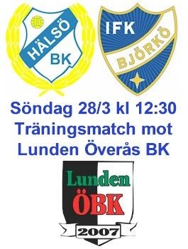 Lunden Överås BK – Hälsö/Björkö (0-4) Hälsö/Björkös mål gjordes av: 0-1 (26min) Henrik Gustafsson, 0-2 (39min) Jesper Hidetun, 0-3 (47min) Johan Forseström och 0-4 (52min) Andreas Forsmark. - Bortamatch mot Lunden Överås BK och vi visste inte speciellt mycket om detta laget mer än att dom kommer att spela i P-16 serien klass 2A detta året. Det var en gråmulen dag och cirka +5 grader när vi begav oss upp till Lundenområdet, matchen skulle spelas på Överåsvallens konstgräs. Domare Ulf Liljekrantz blåste till spel och matchen startade lite tempofattigt och avvaktande. Men det var ändå via våra snabba djupledsbollar som de farligaste chanserna kom i början av matchen, även om det var lite väl ensidigt. (2min) Åstrand passar till Forse ut på vänsterkanten och Forse spelar smart i djupled till Henke som kommer fri med målvakten, men skjuter mitt på. (5min) Lunden ÖBK friläge där dom springer ifrån vår backlinje, men Wille (som stod i mål i den första halvleken) räddade formidabelt. (12min) Snygg djupledslöpning av Henke igen ut på vänsterkanten och Henke spelar snyggt in till Forse, som laddar ”högersläggan” skottet går strax utanför. Matchen böljar fram och tillbaka och det är inget riktigt ordnat spel, även om vi för det lilla spel som finns. (25min) Snygg djupledspass till Forse som springer igenom och kommer helt fri med målvakten och lyckas med konststycket att skjuta rätt på honom, jag försökte ”chippa” var förklaringen efteråt, bra chans igen. (26min) Men så kom det förlösande målet till slut 0-1 Henrik Gustafsson efter att ha snott åt sig bollen nere vid Lundens kortlinje, bryter in från vänsterkanten och skjuter snabbt som en kobra vid målvaktens närmsta stolpe. Nu är vi inne i en bättre spelperiod med en liten tempoökning. (27min, 31min och 32min) Bra spel och Henke skott igen tre gånger på raken i lite olika situationer, men bollen vill inte in. Erik, Jernarp och Åstrand kämpar på i det tysta på mittfältet kan tyckas, men man håller hela tiden Lundens mittfält under tuff bevakning och stundtals kommer några fina spelsekvenser. Emil och Gustav som spelar mittlås sätts inte på några större prov, förutom ett friläge. Vi gör ett byte i slutet av halvleken, Henke går ut efter att ha sträckt ljumsken bla och in med Jesper på vänsterkanten. I slutet av halvleken blir det lite mer spel på högerkanten och Pontus och Rasmus skapar några fina spelsekvenser. (39min) passning ut till Rasmus som går förbi backen och slår ett fint inlägg till Jesper som knäar in 0-2. Det var också halvtidsresultatet. - Vi gör ytterligare några byten i halvlek och John får äntligen göra årsdebut med att testa på med matchspel, samt att Adde gick in på högerkanten. Nu blev det en liten tempoökning från våran sida och Lunden ÖBK fick allt svårare att hänga med, bättre tryck och bättre passningsspel och mer självförtroende verkade det som. (7min) Andreas Jernarp passar snyggt fram till Forse som löper ifrån sin back och rundar målvakten och skjuter in 0-3 målet med högerdojjan. (12min) Ännu en gång bra spel och det blev mer av denna varan nu med pigga ben från Adde på högerkanten även om spelet denna gång gick via vänsterkanten från Forse till Jesper som snyggt spelar tillbaka till Forse som vänder ut spelet till Adde som skjuter in bollen i mål till 0-4, snyggt spel och bra inställning nu. Efter halva den andra halvleken mattas spelet rejält och Lunden tillåts komma in i matchen allt mer, helt plötsligt har vi svårt att få tag i mittfältet igen och Lunden skapar sin farligaste målchans efter en hörna som nickas i ribban. Sammanfattningsvis en helt OK match som stundtals hade sina ljusglimtar och det är alltid det positiva vi vill ta med oss, men det finns alltid mycket att jobba vidare på och idag skulle man vilja att ytorna på denna stora plan utnyttjades ännu mer, det var vid flera tillfällen som vi borde kunnat vända spelet ut på motsatta kanten, men istället spelar vi in bollen tillbaka in i gröten, där alla motspelarna befanns sig. Samt att vi ibland tog för lång tid på oss innan vi släppte bollen och därmed också blev av med bollen, detta funkar inte mot bättre lag, då blir vi helt bortspelade. Snabbare passningsspel, mer med max två tillslag, så blir detta kanon, det blir bättre och bättre för varje match även om Fjäråsmatchen och 2:a halvlek mot Åsa var väldigt sevärda . Nu är det träning på tisdag 30/3 och sedan träningsmatch på ONS 31/3 Nästa träningsmatch blir på ONS 31/3 klockan 18:30 mot BK Häcken på Slätta Damm konstgräs igen. - LAGET SOM SPELADE MÅLVAKTER William Alexandersson Andreas Johannesson BACKAR Rasmus Einarsson Gustav Lundbeck Emil Henricsson Petter Magnusson MITT1 Erik Alexandersson Johan Åstrand MITT2 Pontus Karlsson Andreas Jernarp Henrik Gustafsson TOPP Johan Forseström RESERVER Jesper Hidetun Andreas Forsmark John Samuelsson