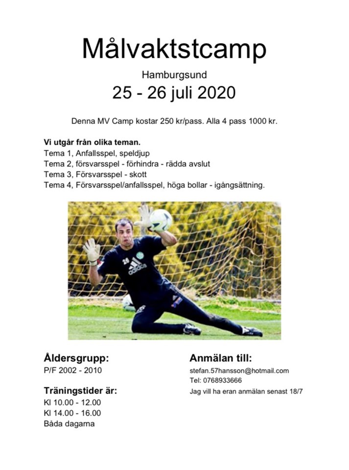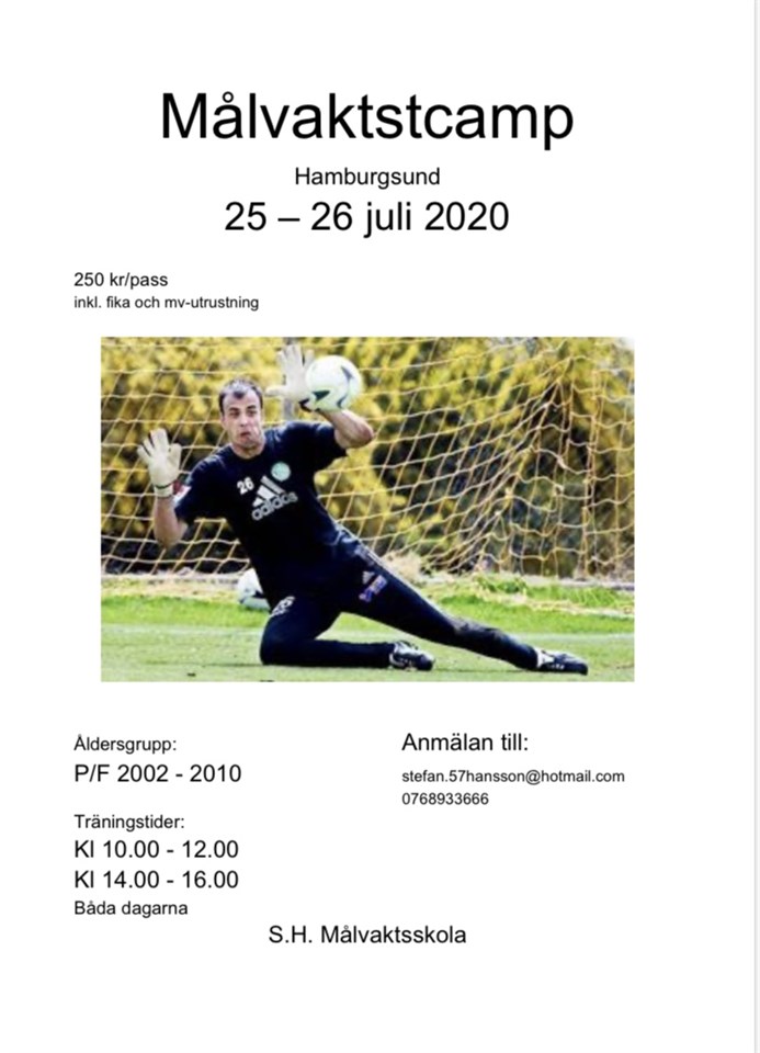 Ni missar väl inte att anmäla era barn till Målvaktscamp med S.H Målvaktsskol i Hamburgsund helgen den 25-26/7. Mer info hittar ni på bilden! Man väljer själv om man vill vara med på alla träningspassen eller bara på ett träningspass. På dessa passen går Stefan ner lite djupare på de olika teorierna. Missa inte denna chansen!