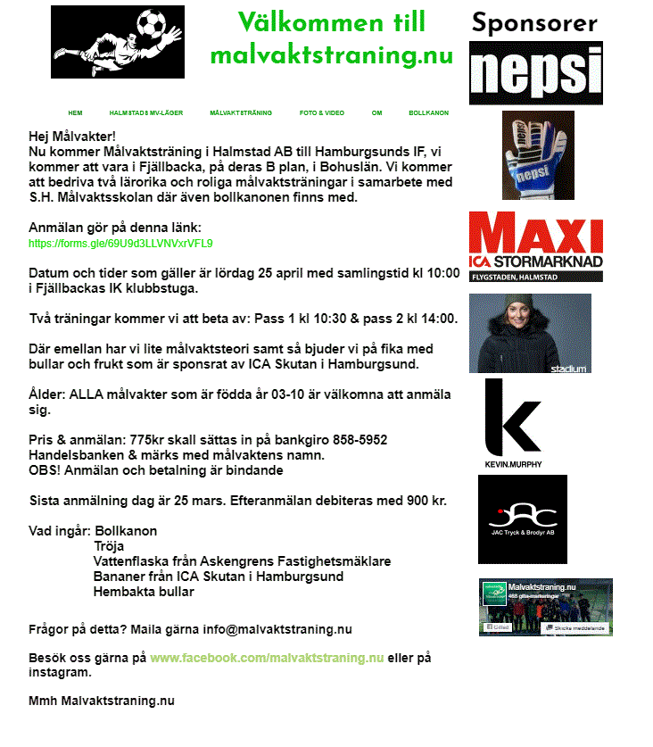 Nu kommer Målvaktsträning i Halmstad AB till oss i Hamburgsunds IF. Träningen kommer att vara i Fjällbacka på deras B-Plan lördagen den 25/4. Det kommer att bedrivas två lärorika och roliga målvaktsträningar i samarbete mellan Målvaktsträning i Halmstad AB och S.H. Målvaktsskola det kommer även att vara med en bollkanon under träningarna. Mer info och hur ni anmäler er finner ni på länken nedan. https://www.malvaktstraning.nu/