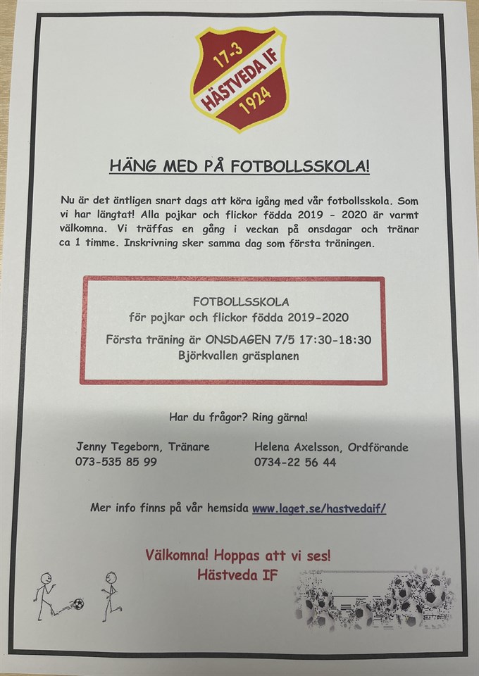 Alla killar och tjejer som är födda 2019 - 2020 är varmt välkomna att börja träna i vår Fotbollsskola. Vi kommer att träffas en gång i veckan - onsdagar kl. 17.30-18.30 på Björkvallen, gräsplanen. Träningen startar onsdag 7 maj kl. 17.30, då sker även inskrivning. Har du frågor så kontakta gärna Jenny Tegeborn 073-5358599. Välkomna till vår fotbollsskola! /Hästveda IF