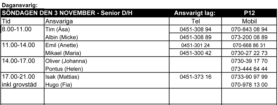 Nu har jag fördelat kiosktiderna till Snapphanecupen den 3:e november då vi har ansvaret för kiosken. Om ni behöver byta tid så får ni göra detta själva, kontakta någon annan på listan och fråga om ni kan byta osv. Tiderna är fördelade såhär: SÖNDAGEN DEN 3 NOVEMBER - Senior D/H Ansvarigt lag: P12 Tid Ansvariga Tel Mobil 8-11 Tim (Åsa) 0451-308 94 070-843 08 94 Albin (Micke) 0451-308 89 073-200 08 89 11-14 Emil (Anette) 0451-301 24 070-668 86 31 Mikael (Maria) 0451-300 42 0730-27 22 73 14-17 Oliver (Johanna) 0730-39 17 70 Pontus (Helen) 073-444 64 44 17-21 Isak (Mattias) 0451-373 16 0733-90 97 99 Hugo (Fia) 070-978 13 00 Sista tiden är inkl grovstäd Hoppas att detta kommer att funka utan problem! Hälsningar Jeanette P13/14 23 okt 2013 0kommentarer