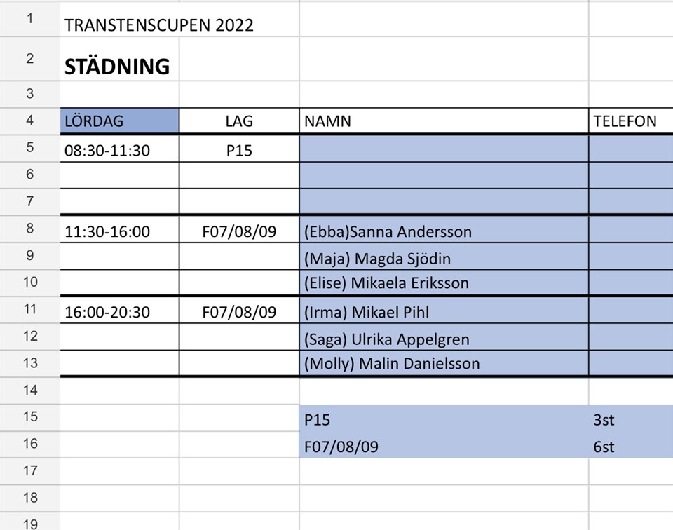Hoppas ni alla njuter av sommaren! Här kommer lite information om Transtenscupen och träningar. Vi kommer att spela cupen på lördagen den 13/8, länk till spelschema kommer senare. Jag gör en ny kallelse till cupen- Svara på den snarast! Våra arbetspass är på lördagen och innefattar städning. Vi ska bemanna 6 pass mellan 11.30 och 20.30, jag gör ett schema och lägger ut det under kommande dagar. Vi kommer att träna tisdag 9/8 och torsdag 11/8. På måndagen den 8/8 är vi inbjudna att göra en träning tillsammans med Forwards F07/08 på Trängens IP. Vi samlas i Hallsberg på IP 16.30 och åker gemensamt. Anmäl er om ni vill med! Ang träning och spel med Div3 laget så inväntar jag svar från deras tränare. De har en match den 7/8. /Tränarna F-07/08 27 jul 2022 2kommentarer