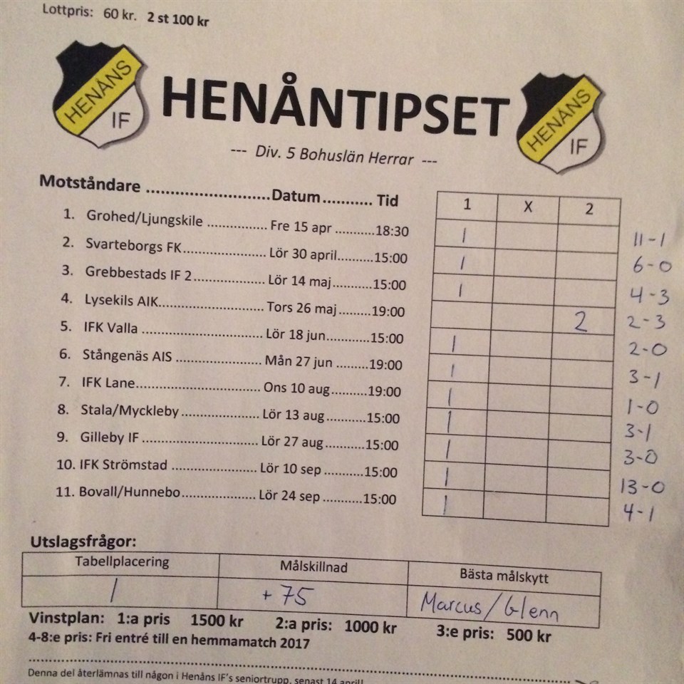 I och med att inte bara sista hemmamatchen, utan även sista matchen i serien, är spelad så går det nu att ge ett resultat i den rafflande avslutningen av Henåntipset... Redan inför den sista hemmamatchen visste vi att vi inte skulle ha en klar segrare innan sista matchen var spelad. Det var tajt i toppen på den interna skytteligan, vilket skulle kunna bli avgörande. Till slut visade sig det bli en enkel matematisk historia att rätta utslagsfrågorna... 11 tippare hade nämligen tio av elva rätta tecken och dessutom rätt på två av utslagsfrågorna. Således hade de skrivit Tabellplacering: 1 samt hade antingen Glenn eller Marcus som bäste målskytt - eftersom båda slutade på 24 baljor (riktigt starka siffror för övrigt) och det tas ingen hänsyn till att Glenn gjort tre av sina på straff... Som ni förstår sållades inte så många bort här - och till slut avgjordes detta med en målskillnadsaffär. Laget slutade på den smått osannolika målskillnaden 95-20, vilket alltså innebär +75!!! Ingen hade kunnat gissa på ett så stort plustal utan priserna fördelas helt enkelt i fallande skala efter en blandning av optimism och skicklighet! Vi gratulerar Ingemar Nilsson till vinsten i Henåntipset! Ingemar hade alltså 10/11 rätt (tippade enbart hemmavinster), har korrekt på två av utslagsfrågorna och gissat bäst på målskillnaden med sina +61. Här följer hela listan, med målskillnaden inom parentes, samt priserna: 1. Ingemar Nilsson (+61), 1500kr 2. Glenn Johansson (+48), 1000kr 3. Björn Åkerström (+46), 500kr Utöver pallplatserna blir det fri entré till en hemmamatch 2017 för dessa: 4. Ingrid Johansson (+39) 5. Stefan Öhlander (+37) 6. Alexander Wingdén (+34) 7. Janne Holst (+33) 8. Bengt Johansson (+26) De tre i toppen kontaktas inom kort! Ni som ligger steget efter får vänta tills biljetterna för säsongen 2017 ska släppas! Tack för i år!