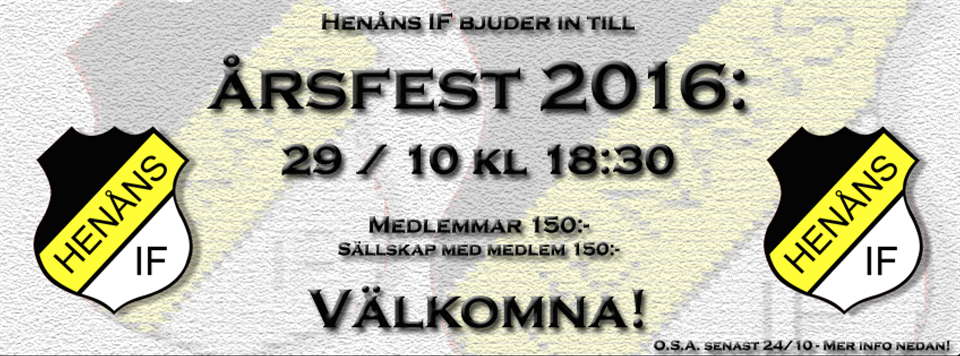 Välkomna att fira 2016 med oss på Ivars Färg Arena! Och i år finns det lite extra att fira; vårt damlag har klarat sig genom sitt första år med allt vad det innebär, och herrarna vann sin serie och spelar i division fyra nästa år! Efter välkomstdrink och mingel serveras en god varmrätt från Kalaskockarna. Under kvällen hjälps vi åt att hålla uppe stämningen med diverse visor, ramsor och allmänt gött snack! Det blir lite prisutdelningar, kaffe/kaka och troligtvis en eller annan historia från Frasse. Vi serverar bubbelvatten, vill ni ha något annat att dricka är det det enda ni behöver ta med -vi fixar resten! För musiken står Stenungsundsduon Zight. På repertoaren finns en härlig blandning av olika låtar där det säkert finns något som passar alla! ATT ANMÄLA SIG: För att få komma behöver man göra detta senast den 24/10: Betala 150:- om du är medlem (eller kommer tillsammans med medlem) till Bg. 406-2725, eller swisha till 123 237 43 79. Märk med namn (och ev. allergi). Sen är det bara att komma ihåg det namnet i entrén! ;-) Har ni funderingar kan ni skicka dem till Alexander Wingdén, via Facebook eller 0702933621. Varmt välkomna till årets höjdpunkt önskar Henåns IF!