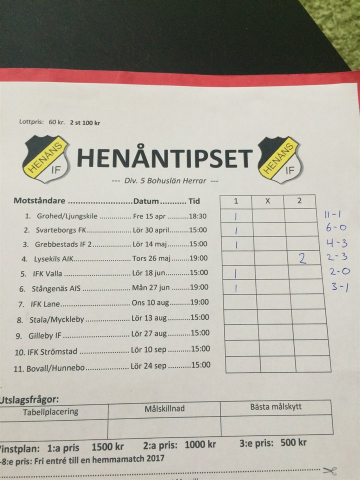 Efter sex spelade hemmamatcher är det dags att se hur ställningen är i Henåntipset... Vi har nu kommit lite mer än halvvägs i serien med 12 spelade matcher - och också lite fler än hälften (sex av elva) av hemmatcherna har färdigspelats. Av de sex spelade hemmamatcherna har det blivit fem vinster och en förlust för Henån och det är faktiskt en enda tippare som hittills har lyckats få alla tecken på rätt plats! Så Malin Börjesson är just nu i ensam ledning och kommer så att vara åtminstone fram till 10 augusti då det är nästa hemmamatch. Men hon skuggas av inte mindre än 30st tippare som ligger på fem rätta tecken... /Tipsansvarig