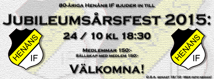 Nu är det dags igen! Vi firar året som gått tillsammans, och du är välkommen! I år fixar Christers en god bit mat, och som vanligt blir det några allsånger, en del priser och kanske ett eller annat gott skratt! Medtag egen dryck, så står vi för resten helt enkelt! Senare på kvällen är det dags för levande musik, och den här gången får trubaduren One ForAll stå för den biten. För er som inte känner till honom har han varit i branschen i 35 år och spelar från ett brett urval med alltifrån schlager och country till 80- och 90-talsfavoriter! ATT ANMÄLA SIG: För att komma är det bara att göra följande senast 19/10: Betala 150:- om du är medlem (eller i sällskap av medlem) till Bg. 406-2725, eller swisha till 1232990471. Märk med namn (och ev. allergi). Sen är det bara att komma ihåg det namnet i entrén! ;-) (Det räcker alltså INTE att bocka i "Jag kommer" på detta evenemang!) Har ni funderingar kan ni skicka dem till Angelica Fransson, via 0705-23 72 61 eller angelicafransson@hotmail.se. Varmt välkomna önskar Henåns IF!