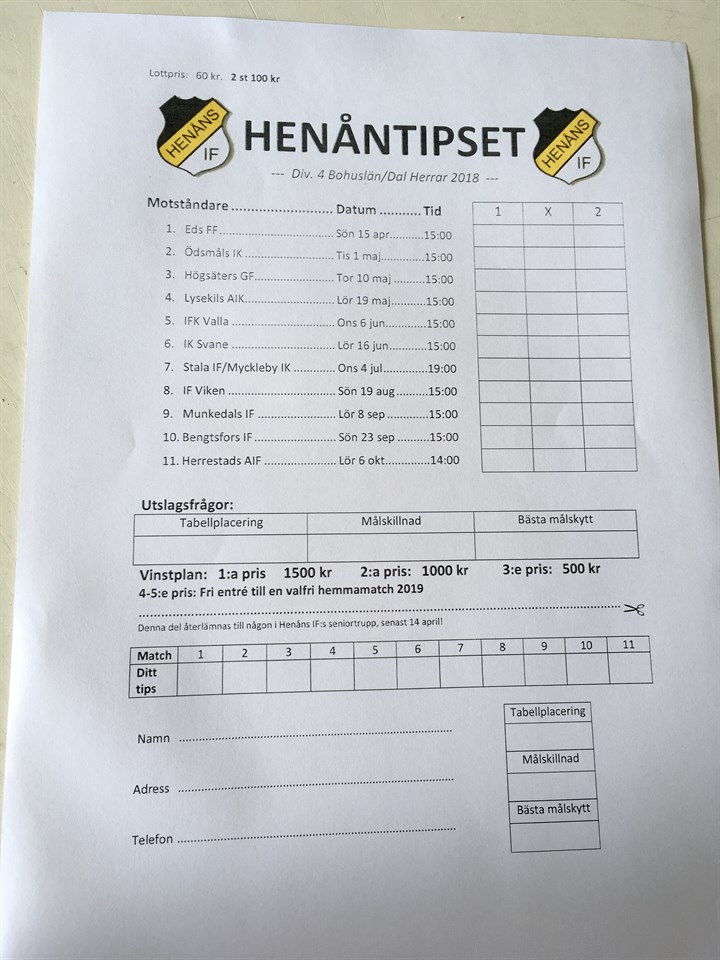 När vi kommit en bit in i sommaruppehållet är det också dags att få ställningen i Henåntipset Efter en brokig vår för Henån med en svag start och en stark avslutning med vinster i de tre senaste hemmamatcherna så har det varit en svårtippad vårsäsong. Men här är ställningen: Två tippare har lyckats att få in sex rätt på de sju hemmamatcherna. Dessa två delar med detta förstaplatsen och det är Ingrid Johansson och Victor Dahlgren. Vi har sedan sju stycken som ligger på fem rätta tecken - och en uppsjö av tippare som är strax därbakom Höstsäsongen inleds borta mot Ödsmål och det är inte dags för hemmamatch (och alltså nästa match i tipset) förrän Viken kommer på besök den 19 augusti /Tipsansvarig