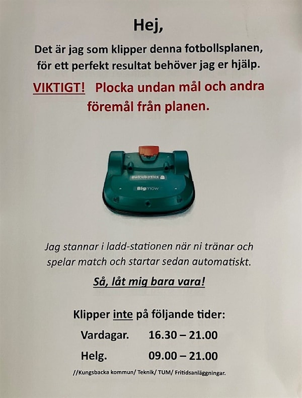 Alla behöver hjälpas åt att flytta undan mål och föremål efter sig på gräsplanerna då Robotgräsklipparen skall kunna göra sitt jobb. Nytt för i år är att roboten INTE klipper 16.30 - 21:00 vardagar respektive 09:00 - 21:00 på helger.