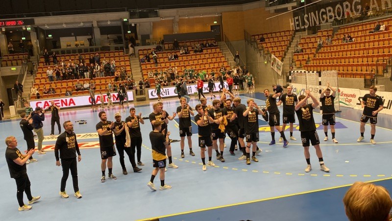 ÄNTLIGEN TILLBAKA I HANDBOLLSLIGAN! HF Karlskrona är tillbaka i handbollsligan efter att besegrat OV Helsingborg i den femte och avgörande drabbningen på bortaplan i fredags. Vilken lycka för alla HFK fans, inte minst alla Lejon, som i flera år kämpat tillsammans med HFK för att åter komma upp i handbollens finrum. Fredagsmatchen, eller ska vi säga hela dagen, präglades av en närmast hysterisk nervositet. Ena stunden intalar man sig att, visst detta kommer att gå bra, vi vinner. Till att i nästa stund vara tillbaka på "pessimismens bakgård", neeej det här "gaur aallri!" Likadant var det vid matchupptakten, 4-0 underläge och inget stämde, inga räddningar, inga skott från nio meter, inspelen sken med sin frånvaro... men ju längre matchen led kom våra, för dagen, gulklädda krigare in i matchen och i halvtid var det bara ett mål som skilde. I andra halvlek var det HFK som tog tag i taktpinnen och när vi för första gången i matchen tog ledningen,13-12, då var OV redan ett allsvenskt lag. HFK visade stort hjärta och kunde till taktfasta klapp och hejaramsor från den tillresta HFK klacken ta ett järngrepp om andra halvlek. Nu behövde ingen oroa sig för svackor i spelet eller skott som inte gick in, eller försvarsspel som läckte. Uros storspelade i målet ännu engång, skotten från nio meter satt som hand i handske och försvarsspelet släppte ingen jävel över bron. Nej, detta var fredagen då våra handbollsgudar var på vår sida, äntligen. När slutsignalen ljöd var det bara ren eufori, spelare som hoppade, spelare som kramades, en klack som skrek ut sin vilda lejonglädje. Ta mig tusan om jag inte såg en eller ett par glädjerårar också. VI ÄR TILLBAKA ekade i en alltmer avfolkad Helsingborg Arena där bara HFK spelare och supportrar var kvar en timma efter matchavgörandet. En bussresa från en bortamatch har nog aldrig varit så härlig. Vid ankomsten till Brinova Arena kunde en skara Lejon rigga upp för ett varmt mottagande när spelarbussen anlände. Fyrverkerier och tomtebloss mötte spelarna när de kom "hem till staun" och till klackens "alla älskar HFK i staun" kunde firandet fortsätta för spelare och supportrar på något av stans inneställe, om det finns något sådant nu för tiden. Men det är en annan historia som inte undertecknad har någon som helst insyn i. Trötta och lyckliga kunde vi ta oss hemåt i natten efter väl förrättat värv. HFK i handbollsligan, sug på den. Nog drömde vi väl, den natten, kanske lite till mans om sm slutspel, SM guld, AMO derby och knäppa "stocken" på näsan.....nej nu får det vara nog, innan vi laddar för en ny säsong ska alla spelare ha en välförtjänt ledighet. Hoppas att många vill ansluta till södra ståplats i lejonklacken när det drar ihop sig framåt hösten, TILLSAMMANS ÄR VI STARKA!! HJÄRTA, GLÄDJE, GEMENSKAP!!