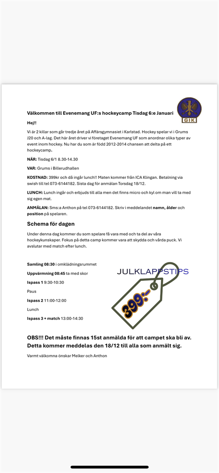 Jag lovade mina elever att göra reklam för ett nytt Camp i Billerudhallen Tisdag 6/1.