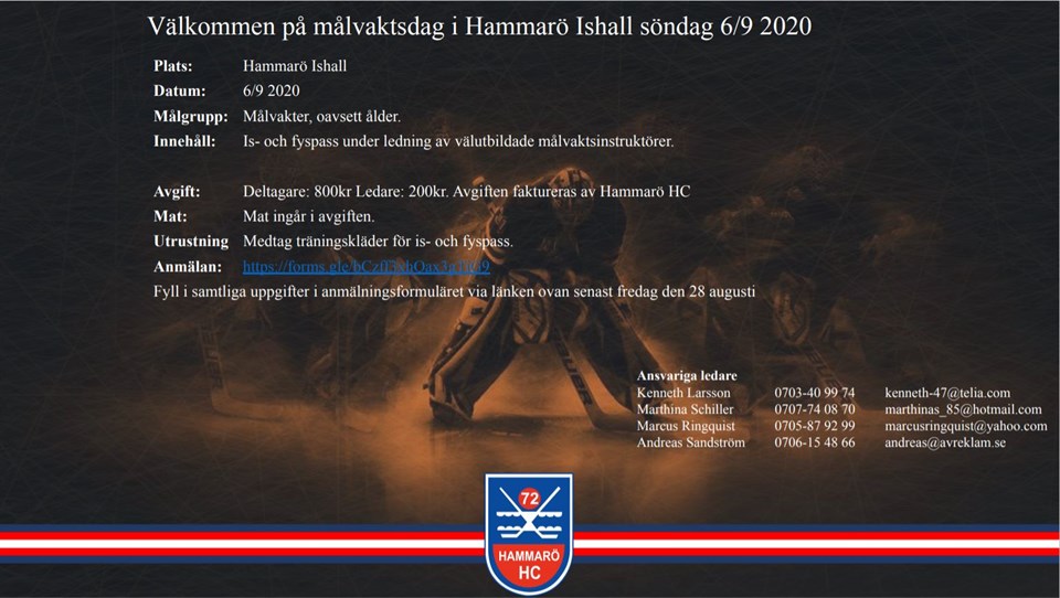 Söndag 6 september är det dags för målvaktsdag på Hammarö, perfekt start på säsongen! Mer info finns i inbjudan som ni hittar på Dokument-sidan Anmälan görs på denna länk Välkomna! Målvakter 19 jul 2020 0kommentarer