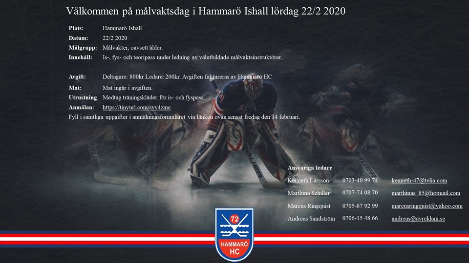 Nu är det dags igen, ny målvaktsdag i Hammarö Ishall, denna gång 22/2 2020 Perfekt julklapp till era målvakter! Anmälan görs på denna länk Välkomna! Målvakter 3 dec 2019 0kommentarer