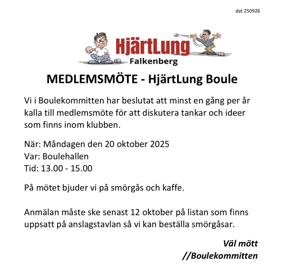 HjL Boule - Medlemsmöte | 20 okt, 13:00 |
