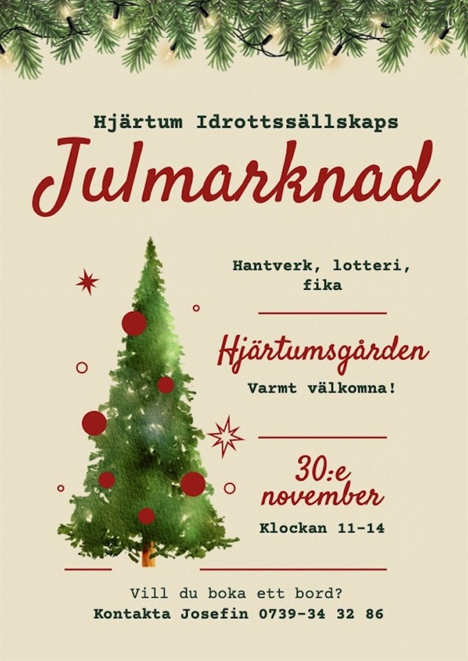 Hjärtligt välkomna till Hjärtums IS årliga julmarknad där det kommer finnas fina hantverk lotterier samt fika att köpa.
