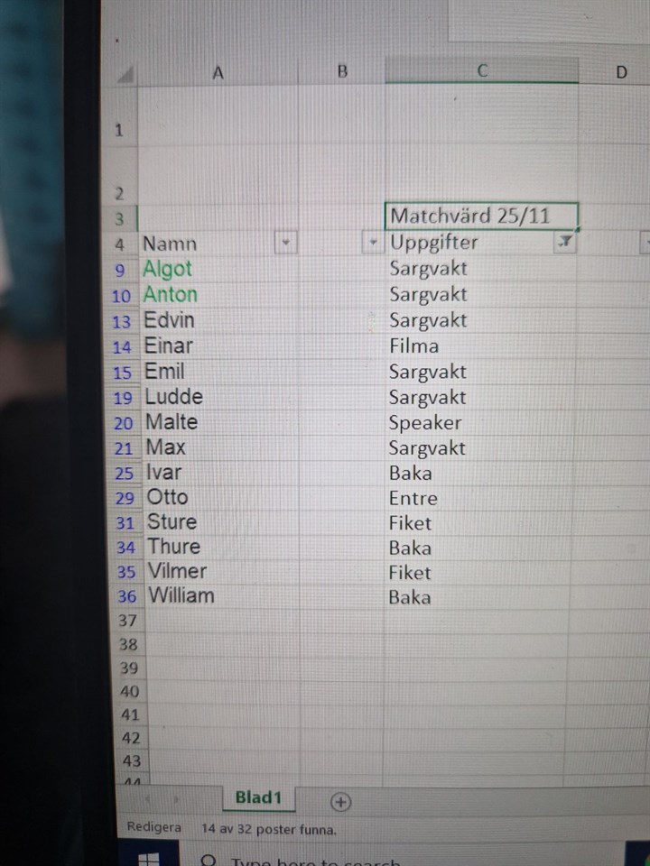 Hej alla, Tack lör ett fantastiskt samarbete, listan fylldes på inom loppet av ett dygn! Här kommer en sammanställning öve vem som gör vad; Sargvakter; Algot, Anton, Emil, Ludde, Max och Edvin Film; Einar Speaker; Malte Entre; Otto Fiket; Sture och Wilmer Baka; Thure, Ivar och William //Föräldragruppen