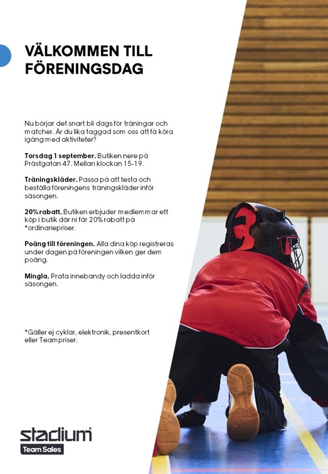 Är ni lika taggad som oss att få köra igång med aktiviteter? Välkommen på föreningsdag på Stadium - Mittpunkten! Torsdag 1 september Klockan 15-19 Stadium Prästgatan 47 Träningskläder Passa på att testa och beställa föreningens träningskläder inför säsongen. 20% rabatt Butiken erbjuder medlemmar ett köp i butik där ni får 20% rabatt på *ordinariepriser. Gäller ej på cyklar, elektronik, sup, presentkort, teampriser eller produkter som levereras direkt från våra samarbetspartners. Poäng till föreningen Alla dina köp registreras under dagen på föreningen vilken ger dem poäng. Mingla! Prata innebandy och ladda inför säsongen.