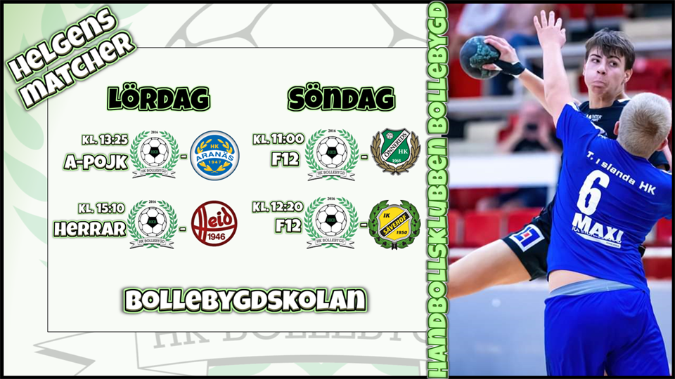 HEMMAMATCHER På lördag är det två matcher i Bollebygdskolans stora hall. A-pojkarna möter HK Aranäs i P16 Väst 2 Västra klockan 13.25. Aranäs leder serien med 14 inspelade poäng på 8 matcher, medan HK Bollebygd är femma med 6 poäng på 8 matcher. Efteråt är det våra herrar som också får ta sig an en serieledare, BK Heid i Herr 4 Väst Södra. BK Heid har inte tappat en poäng på de första 8 matcherna och ståtar med 16 poäng. Våra herrar är femma med 6 poäng på 7 matcher. Avkast klockan 15.10. På söndag spelar F12 mot Önnered i F12 Västra 2 Västra. Önnered leder serien med 16 poäng på 8 matcher, HKB är tvåa med 12 poäng på 8 matcher. Matchstart 10.00. Klockan 12.20 är det nästa gäng från F12 som spelar i F12 Väst 3 Södra mot Sävehof. I denna serie är HKB femma, och Sävehof är sexa. BORTAMATCHER P12 spelar totalt tre matcher på bortaplan. Ett gäng åker till Alingsås för matcher mot Alingsås HK (11.00) och Borås HK 84 (13.00) och det andra gänget åker till Partille för match mot Sävehof kl. 11.45. F11 åker till Stenkullen för match mot IK Baltichov kl. 14.30 på söndag. Vi önskar alla lycka till!