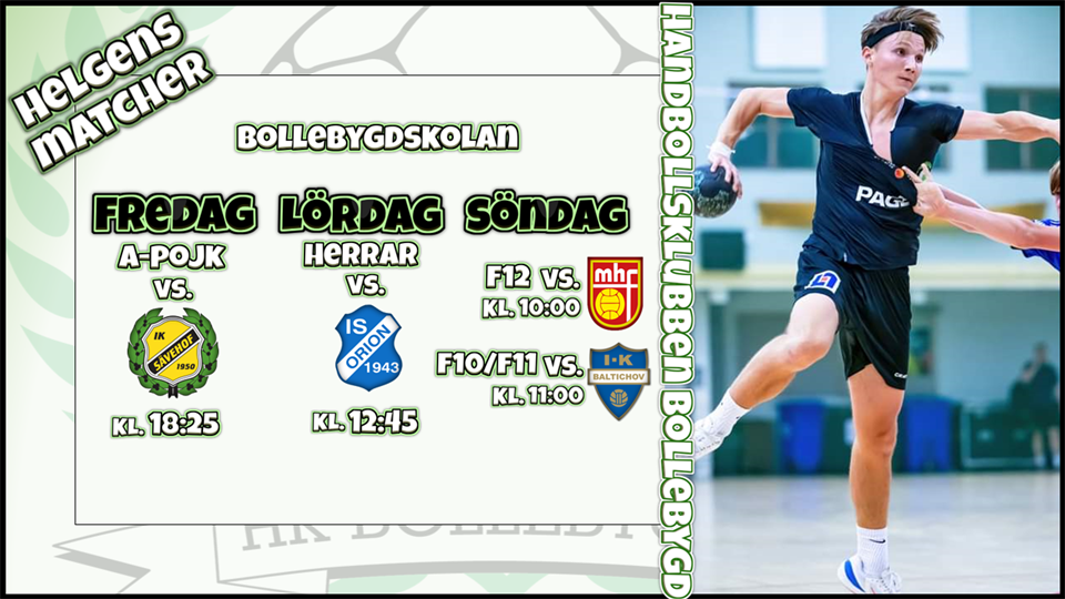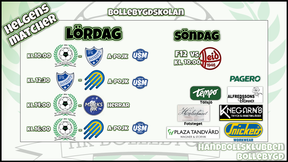 HEMMAMATCHER På lördag är det fullt ös i hallen! Våra A-pojkar födda 2007/2008 spelar ungdoms-SM (steg 2) på hemmaplan! Första matchen är redan kl. 10 mellan våra pojkar och IFK Bankeryd. I steg 1 mötte IFK Bankeryd lag från IK Sund, Vinslövs HK och KFUM Trollhättan. IFK Bankeryd hamnade på tredjeplats med en vinst mot KFUM Trollhättan. HK Bollebygd hade en tuff grupp i steg 1 och mötte Lödde Vikings HK, Lugi HF och Redbergslids IK, och hamnade fyra utan några poäng den gången. Kl. 12:30 spelar IFK Bankeryd mot det tredje laget i gruppen, HF Karlskrona. HF Karlskrona slutade med 0 poäng i steg 1, där de mötte IF Kristianstad, Ystads IF HF, Kärra HF och Huddinge HK. Kl. 14:00 spelar våra herrar mot Marks HK i division 4. Sista matchen för dagen spelas 16:00 mellan HK Bollebygd och HF Karlskrona, och förhoppningsvis kan vi hjälpa våra killar till avancemang till steg 3 med en rejäl hejaklack. På söndagen spelar F12 hemmamatch mot BK Heid i F12 Väst 3 Södra. Heid är serieledare med 9 vinster och 1 förlust, HKB är fyra i tabellen med 5 vinster och 5 förluster. Ett extra stort tack till vår sponsorer som på olika sätt stöttat arrangemanget kring USM: Pagero, Tempo Töllsjö, Alfredssons Blommor, Fotsteget, Knegarn's, Plaza Tandvård och Snickers Workwear. BORTAMATCHER På lördag åker P12 till Varberg för match mot HK Varberg kl. 14:30 i P12 Väst 2 Sydväst. I denna serie är HKB än så länge obesegrade och står med 6 vinster på 6 matcher, medan Varberg har 4 vinster och 2 förluster. P12 spelar borta även på söndagen, mot Marks HK kl. 10:00 i P12 Väst SD 3. Även här är HKB serieledare med 5 vinster och 1 förlust. Mark har inlett med 1 oavgjord och 5 förluster. F12 spelar tidig seriefinal mot Önnered på söndagen kl. 16:10 i F12 Västra 2 Västra. Önnered står med 7 segrar de första 7 matcherna, medan HKB har 6 vinster och 1 förlust. Lycka till allihopa, särskilt till A-pojk som spelar USM!