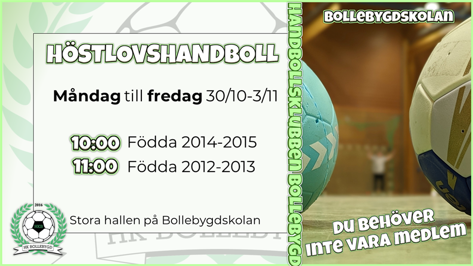 Nästa vecka är det höstlov. Alla barn födda 2012-2015 är välkomna till stora hallen för att spela handboll och hitta på en massa skoj tillsammans. Barnen behöver inte vara medlemmar i HK Bollebygd. Det går bra att vara med en dag, ett par dagar, eller alla dagar. Aktiviteten är helt kostnadsfri, 0 kronor! Barn födda 2014-2015 kl. 10:00-11:00 Barn födda 2012-2013 kl. 11:00-12:00