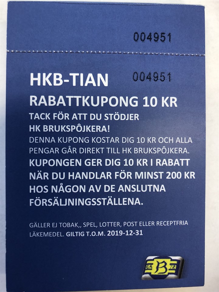 Nu kan du stötta vår förening men samtidigt få tillbaka dina pengar. Vi har glädjen att meddela er alla att vi i dagarna börjar sälja något som vi kallar HKB-TIAN. HKB-TIAN är ett enkelt men genialiskt kuponghäfte, där du köper kuponger för 10 kr/st. När du sen handlar hos något av de medverkande företagen för minst 200 kr, så är den värd 10 kr i kassan. För varje ytterligare 200 kr du handlar för, kan du utnyttja ytterligare HKB-TIOR. Kupongerna är giltiga under ett års tid, mellan 1 januari och 31 december 2019. Du får därmed tillbaks hela summan och HK Brukspôjkera får in välbehövliga medel till verksamheten. Hela framgången med HKB-TIAN bygger på våra fantastiska lokala företag som ställer upp och erbjuder denna möjlighet. Här nedan ser du en lista på inköpsställen där du kan nyttja HKB-TIAN vid köp för minst 200 kr. - Ica Nära Deje - Deje Trä - Grens Bil & Bärgning - Salong Adam - Boutique Duo - Care of Moa - Louise Fothälsa - Lilla Lagret - Plåt & Takspecialisten HKB-TIORNA är limmade om 50st per häfte men går även att köpa i lösa antal. Beställ ditt häfte via vårt kansli: Mail: hkbrukspojkera@telia.com Tel: 0552-120 55 Tack för att du stödjer klubben och köper ditt kuponghäfte av HKB-TIAN! HK Brukspöjkera 5 feb 2019 0kommentarer